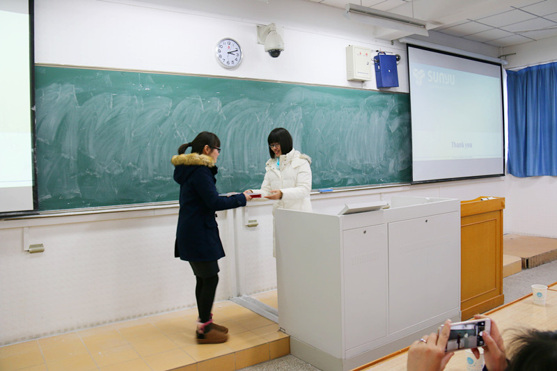 接下来,举行颁奖仪式。此次共设有三个奖项,分别是未来之星奖、品质之星奖和优秀管理人员奖。我院日语系学生李晓晔、赵冲颖等17位同学获得未来之星奖,朱园园获得品质之星奖,赵冲颖、曹蓉获得优秀管理人员奖。舜禹公司日本部经理孙伟女士为以上获奖同学颁奖。值得一提的是,通过这一年的翻译实践教学,舜禹公司已正式录取我院日语系三名学生为其正式职员,并已上岗实习。颁奖仪式结束后,舜禹公司项目经理陈肖对现场的同学进行培训。陈老师结合自身在翻译实践中遇到的问题,耐心而细致地讲解如何处理翻译实践中遇到的问题,让各位同学受益匪浅。最后,日语系金老师总结了此次实践活动的意义,并鼓励日语系学生积极参与,在实践中提高翻译能力,从而成长为优秀的翻译人才。