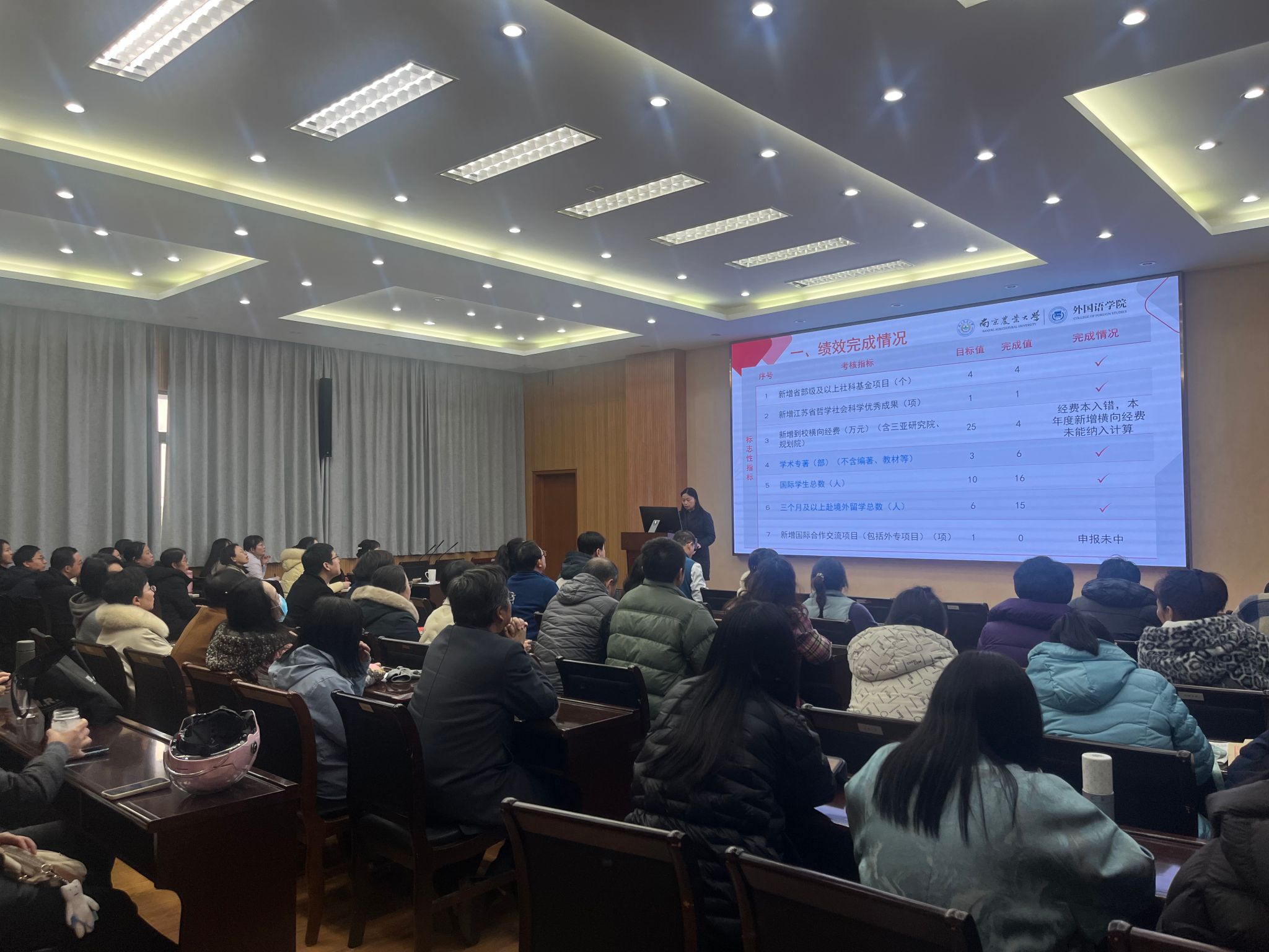 院长裴正薇首先全面回顾了2025年学院发展成效。然后从中共南京农业大学第十二届委员会第二十五次全体会议上校长陈发棣所作的主题报告《聚力攻坚争创一流——在新发展阶段构筑学校发展新优势》出发,围绕“机遇、反思、重塑、行动”四个方面,结合学院发展面临的现实困境,从特色学科建设、强化师资梯队、创新人才培养、科研提质增效、拓展社会服务等明确了新学期的工作方向与具体计划。她勉励全体教职工凝心聚力,坚守立德树人初心,深耕教学科研一线,为培养高素质复合型外语人才贡献力量。
